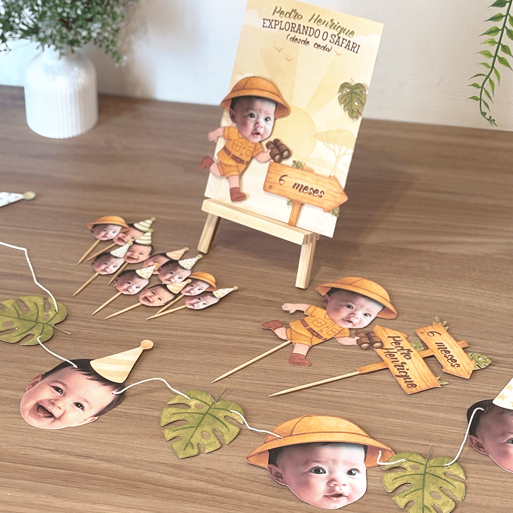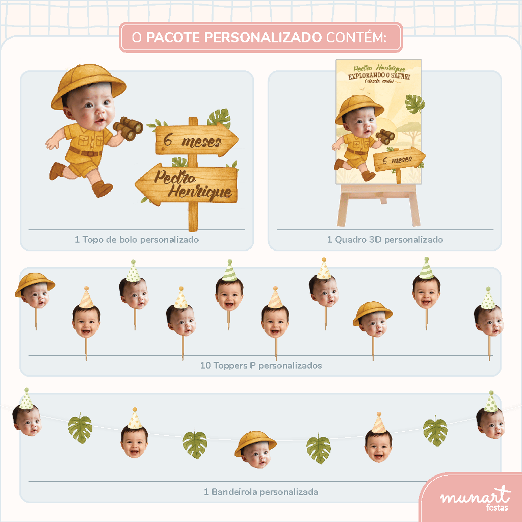 O Pacote Personalizado da Munart vai com o rostinho da criança, nome e idade/mês, criando uma decoração pronta para encantar. Produzido com papel de alta gramatura, já vem pronto para posicionar onde quiser.